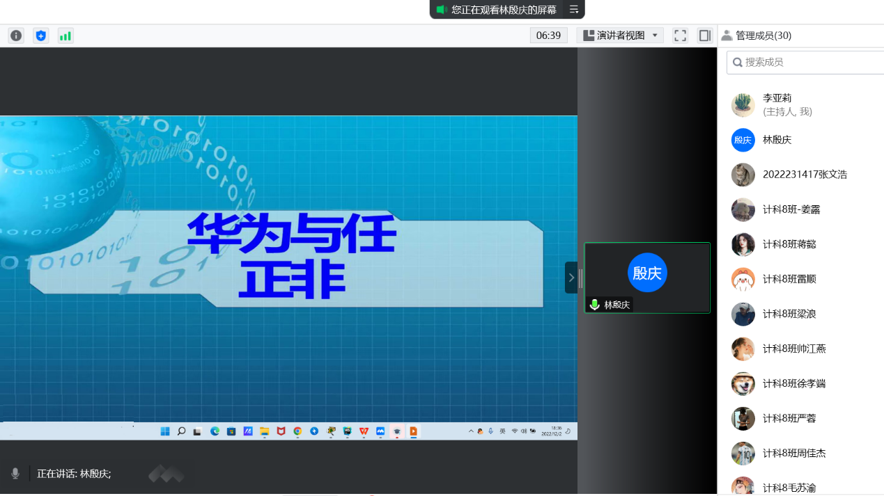 为积极响应我校“信息产业大咖阅读计划”,让学生养成读书的良好习惯并在阅读中汲取前人的智慧,异科导师李亚莉组织其带领的异科导师成员于12月2日18:30在线上举行了《任正非传》大咖阅读分享会,此次大咖阅读的分享人是2022级大数据与计算机科学学院计算机科学与技术9班学生林殷庆,李亚莉异科导师组其他学生也参与了此次分享会。