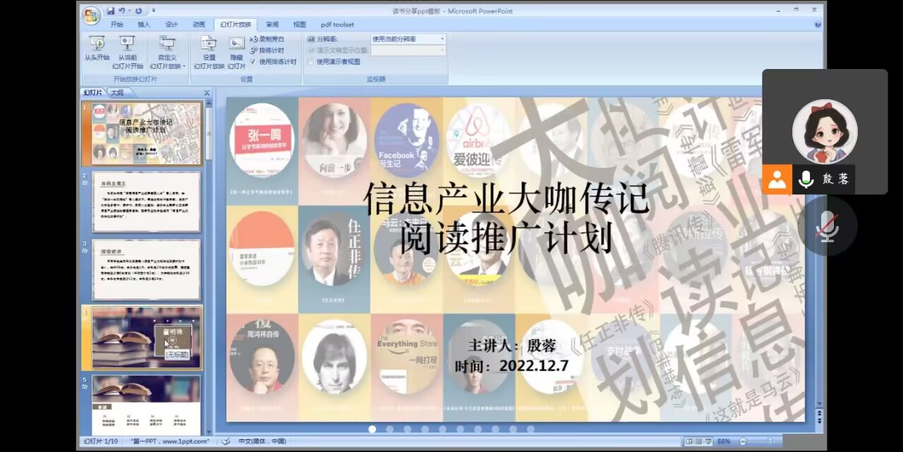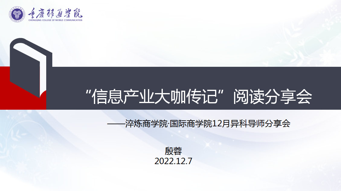 为培养同学们的商科理念与管理者思维,营造浓郁的书香氛围,激励书院学子多读书、读好书,12月7日16时,殷蓉异科导师小组成员2022级工商管理类1班和2班共34位同学齐聚腾讯会议云端,开展了信息产业大咖传记导师分享交流会,与同学们分享和探讨大咖阅读感受。
