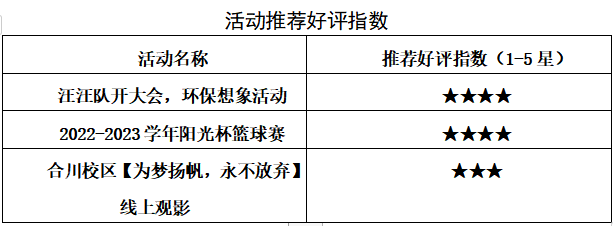 “汪汪队开大会,环保想象活动”该活动主题贴合公益环保且紧跟热点吸引力度较大。完满观察团建议各位组织者、策划人在选题方面着重注意,选题紧跟时事、热点加强吸引力同时符合完满教育精神。“2022-2023学年阳光杯篮球赛”“合川校区【为梦扬帆,永不放弃】观影活动”这两场体育竞技活动传播男篮、女排精神深受学生喜爱,促进学生们对运动项目的喜爱度,完满观察团建议各位组织者可以多组织体育竞技板块相关活动加强我校学子的身体素质及对体育精神的认知。