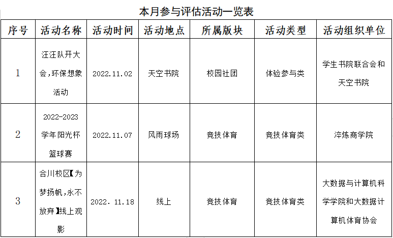 此次“汪汪队开大会,环保想象活动”由学生书院联合会和天空书院联合举办,该活动主题紧贴环保公益方面在废物利用的同时,也增加了同学们的动手能力,给生活增添一点调味剂;2022-2023学年阳光杯篮球赛前期宣传范围广,现场活动秩序较好,基础设施完善,但选择的地点稍有拥挤,给过往人群造成拥挤和不便,时间与预期不符合,超出预定时间结束活动;合川 【为梦扬帆,永不放弃】线上观影活动主题围绕中国女排夺冠热点,让同学们从电影故事中深入感受女排精神,提升思想水平,观影同时缓解紧张情绪,放松心情,此外,该场活动也能促进同学们加强体育锻炼,增强对完满教育认同感。