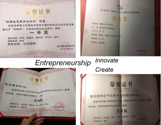 传笋带领他的团队征战各级创新创业大赛,并分别获得:第三届中国“互联网+”大学生创新创业大赛重庆赛区优秀奖、合川区第五届“诚信.鸿立”杯创新创业大赛优秀奖;重庆邮电大学移通学院第七届创新创业大赛一等奖、第八届创新创业大赛三等奖、获评重庆邮电大学移通学院第一届重点项目、获得重庆邮电大学移通学院创新创业奖学金。