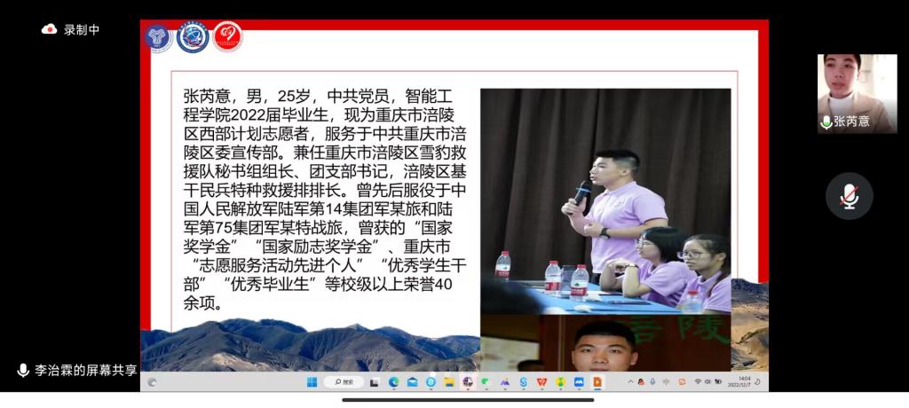 为帮助当代青年了解西部计划,鼓励移通学子到西部去、到基层去,2022年12月7日,通信与信息工程学院青年志愿者协会特邀智能工程学院2018级张芮意同学、通信与信息工程学院2018级周恩荣同学以及通信与信息工程学院2018级刘珊同学,在腾讯会议开展2023年西部计划线上宣讲会。