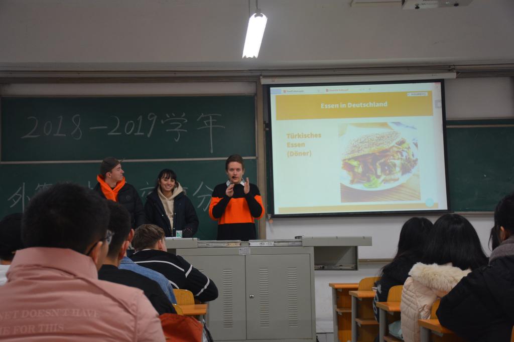 交换生们还讲到了德国的日常饮食以及一些著名节日,一张张看起来很可口的德国美食照片让同学们非常心动,在德国除了好吃的香肠土豆,还有很多来自其他国家的异域美食,比如很受德国人喜欢的土耳其烤肉Döner,以及意大利面,希腊菜等。德国的节日也是很丰富多彩,比如很受年轻人欢迎的狂欢节,也有温馨传统的圣诞节,交换生David还介绍到他家乡的独特节日,人们都会穿着统一的制服在街上游行,场面十分壮观。