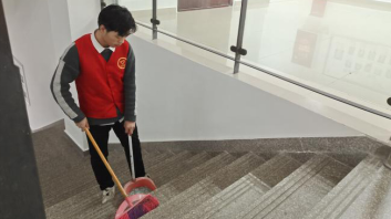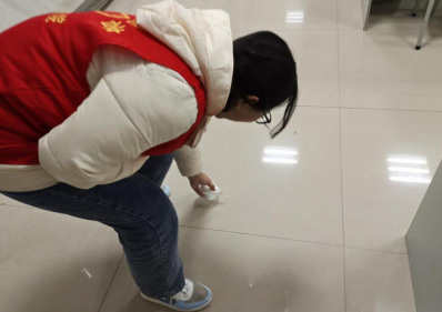 在前往自习室的过程中,位于图书馆一楼电梯附近的地面上散落许多玻璃碎片。考虑到电梯附近的人流量较大。为保证图书馆的行人安全和环境整洁。成员们率先做出行动,用扫把进行了清扫。