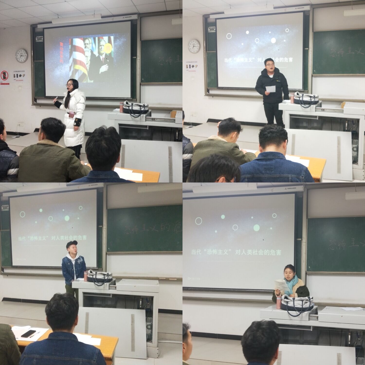 12月18日晚上4204教室,毕瑜老师组织2017级电信工程及管理1-3班、2017级信息工程1-2班全体同学参与的“论恐怖主义的危害”翻转课堂正如火如荼的开展。