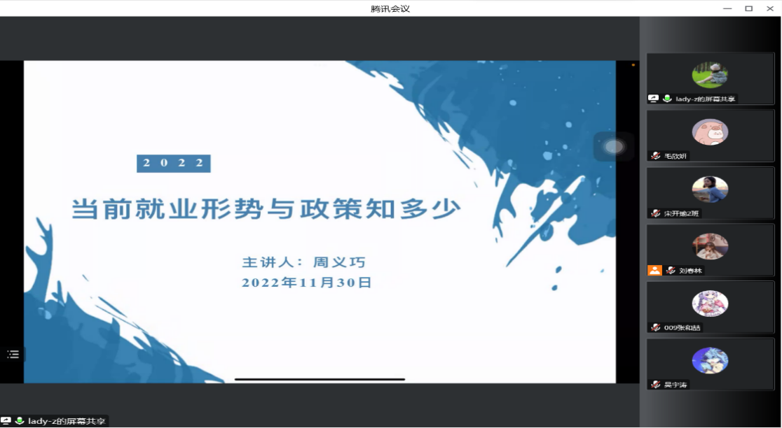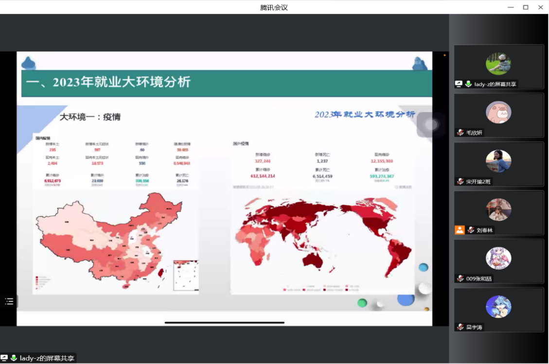 活动开始,周老师先对2023年的就业大环境进行分析,从疫情、国际环境、经济形势、中小企业生存情况、高校毕业生人数的五个方面具体剖析中国当前的大环境,并运用身边的实际事例,引出目前就业难的问题,因此在这疫情汹涌、国际环境不稳定的大环境下,同学们想要顺利找到工作,则要时时关注就业形态的转变,并不断提高自己的就业能力。
