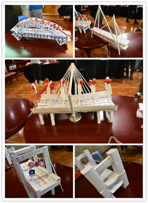 经过前期比赛的层层选拔,共有五支队伍入围决赛。在主持人介绍完国内的特色桥梁之后,比赛正式开始。参赛选手们在规定的桌面上进行纸桥的半成品制作,时间限制为20分钟。每组选手的作品风格形式各异,他们采用不同的思路,专心致志搭建他们的纸桥。本次比赛将从纸桥的设计理念、美观程度以及纸桥设计的寓意决定参赛选手的比赛分数。在规定的时间里,参赛选手运用自己的专业知识和个人想象使得每个参赛作品各自显示出它们的独特之处。