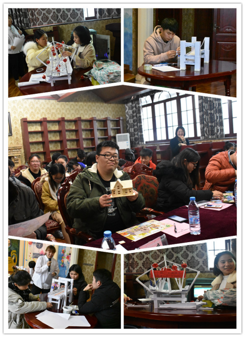 在选手们制作纸桥的期间,各位评委嘉宾们也忙得不亦乐乎,拼装承办方事先准备的房屋立体模型。“时间到!请各组选手停止制作。”随着主持人的口令,比赛进行到评分环节。每组选手对自己的作品从命名到结构及思路进行细致的讲解,评委老师也对此进行点评并打分。第一组“有队名”队的桥梁设计思路来源于公交车坠江事件,因此他们的作品注重于加强桥梁两侧的安全性,提高了人行道的高度。吴自立老师对第一组选手表示支持,指出桥梁的亮点和安全得到很好地体现。第三组“陈赵陈”队的桥梁设计寓意颇多,桥梁的设计来源于钻石桥,由此他们的纸桥的形状像一颗钻石,并由6根支柱构成两个三角形,有三人成众、六六大顺等寓意。曹友露老师非常认同第三组作品的做工精细及其美观程度,并指出桥墩斜置等其中还存在的一些缺点,同时还附以相关改进方法及注意事项。在此之中,其他三组的作品分别体现出方便快捷、传递正能量和红色长龙的桥梁设计理念。