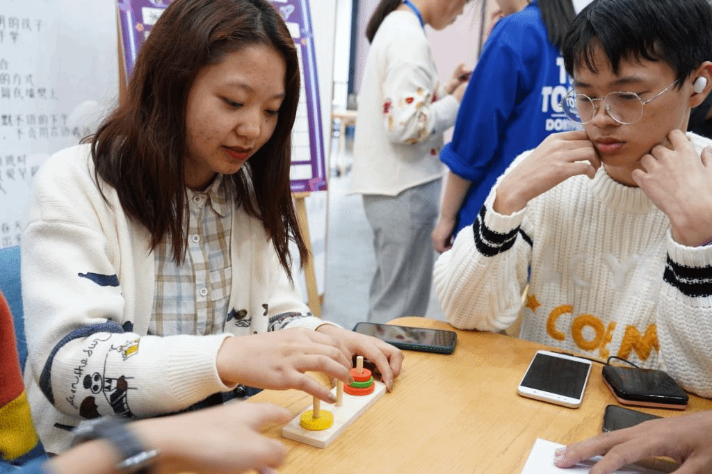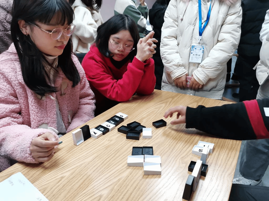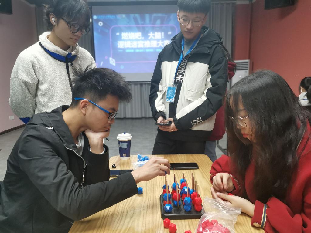 初赛环节中,敏捷而锐利的眼光相互交织,鲁班立方、数字华容道等等都相应解锁。“cpdd队暴力解环”,仅用16秒便成功通过“智力解环”项目,面对该队伍的精彩表现,现场掌声、欢呼声不断,但其他团队也毫不示弱,“燃烧吧!小脑队”在“竞速汉诺塔”项目中,团队成员步调协调、争分夺秒、稳步夺塔。初赛现场气氛热烈、讨论不断,各队伍用逻辑发声,戏各桌风云。