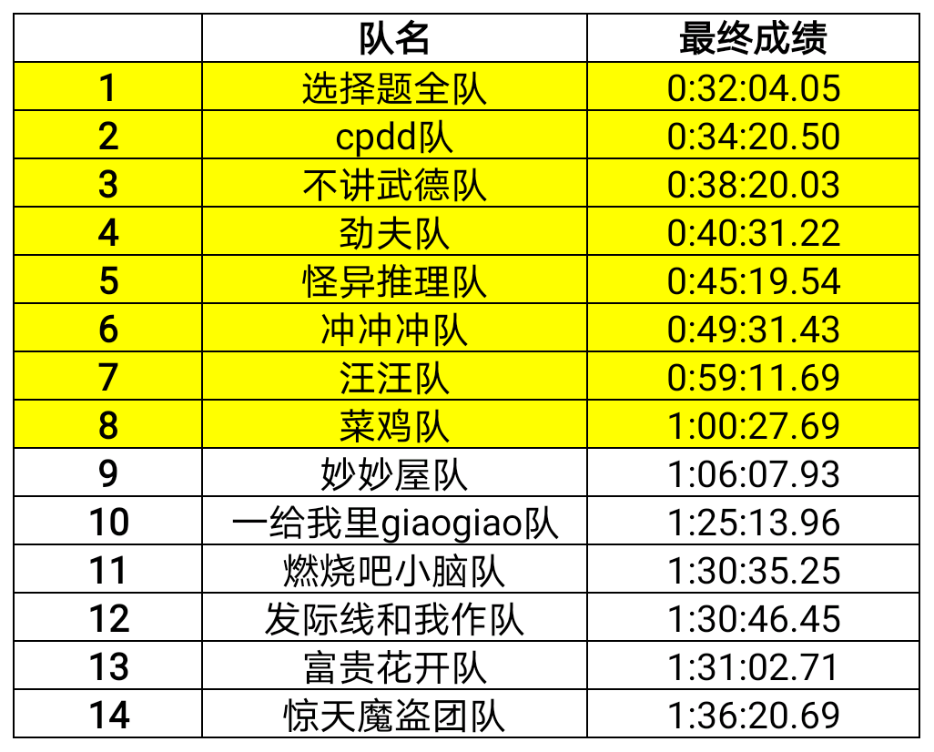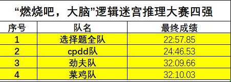 本次决赛共评出冠军、亚军、季军各一名,优秀奖五名。其中“cpdd队”在本次比赛中脱颖而出,荣获冠军、“选择题全队”荣获亚军、“劲夫队”荣获季军。