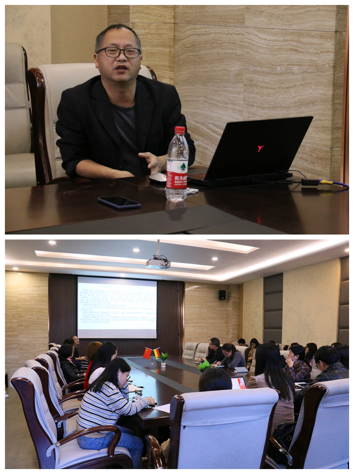 为全面贯彻落实习近平总书记在全国高校思想政治工作会议的讲话精神,落实“使各类课程与思想政治理论课同向同行,形成协同效应”的总体要求,深入挖掘专业课程“思政元素”,11月11日16:00,中德应用技术学院特别邀请思想政治课教学研究部邹建平老师于会议室开展《用“五个讲”讲好课程思政》专题讲座,讲座由侯宇晶副院长主持,学院全体教师参与本次活动。