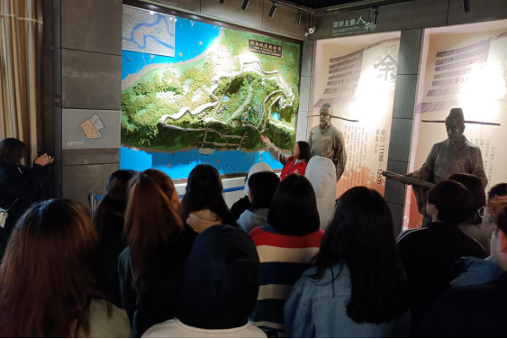 在一楼的大厅,“鱼城雄魂”四个大字映入同学们的眼帘,就此开始了博物馆之旅。同学们跟着讲解员的步伐来到一楼序厅的“前言”,了解钓鱼城之战的背景,接着参观了展厅“钓鱼城遗址模型”和“宋蒙主要历史人物雕塑”,立体的遗址模型使同学形象地了解到钓鱼城遗址的概况以及地理位置分布;在钓鱼城之战重要将领的塑像前,讲解员讲述了余玠、冉琎、冉璞、王坚、张珏等爱国将领的事迹,引起同学们的感慨,钓鱼城军民的抗争精神令人心生敬畏。