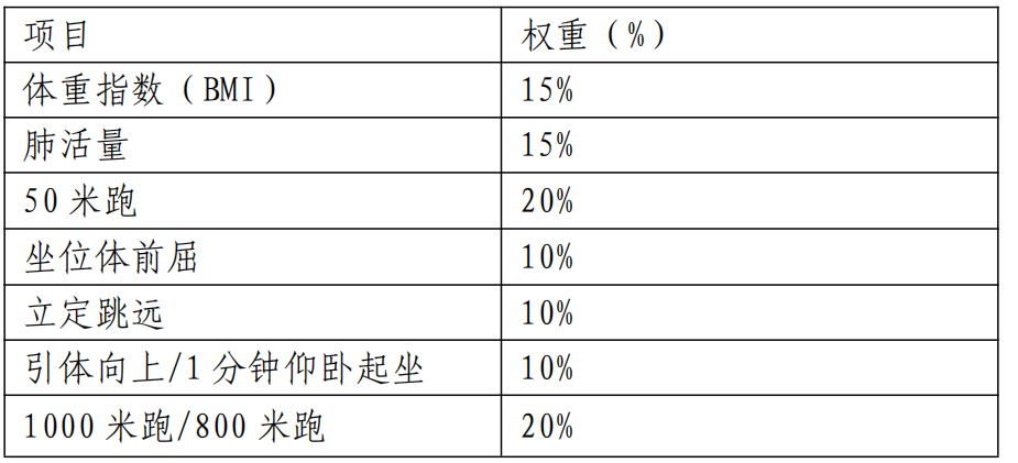 测试标准:依照《国家学生体质健康标准》所列,测试项目占总分的比重如下:评定等级和分数除体重指数(BMI)以外,其余项目均分为两组,即大一和大二年级一组标准,大三和大四年级一组标准。