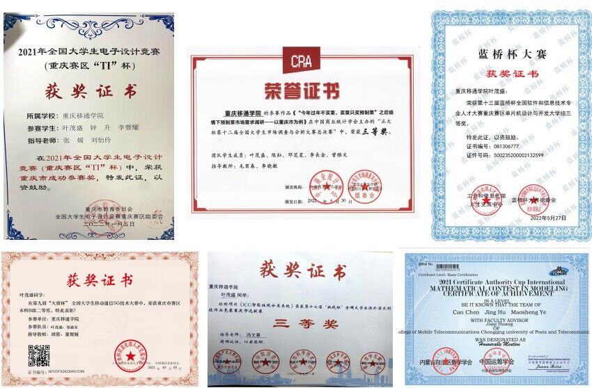 课余期间我参加多项竞赛,获国家级奖项3项,省部级奖项10项,校级奖项23项,其他各级创新创业类奖项5项,并于今年7月在《发展理论改革与实践》期刊发表论文一篇。其中获第十届全国“认证杯”数学建模国赛二等奖、第十二届全国大学生市场调查与分析大赛国赛三等奖、第九届“大唐杯”全国大学生移动通信大赛重庆市二等奖、第八届互联网+创新创业大赛重庆市铜奖、第十三届“蓝桥杯”全国软件和信息技术专业人才大赛重庆市三等奖、第十七届“挑战杯”全国大学生课外学术科技作品竞赛重庆市三等奖等。如果你问我什么能让你成长最快,我会对你说:去参加竞赛吧!比赛中你会遇到有着相同目标的一群人,大家一起相互竞争、相互学习、相互成长,从而提升团队双创能力。