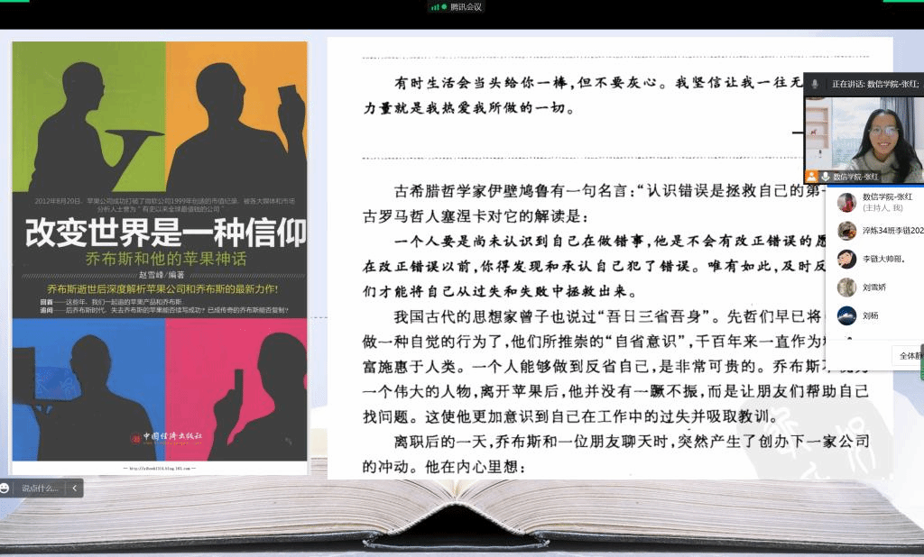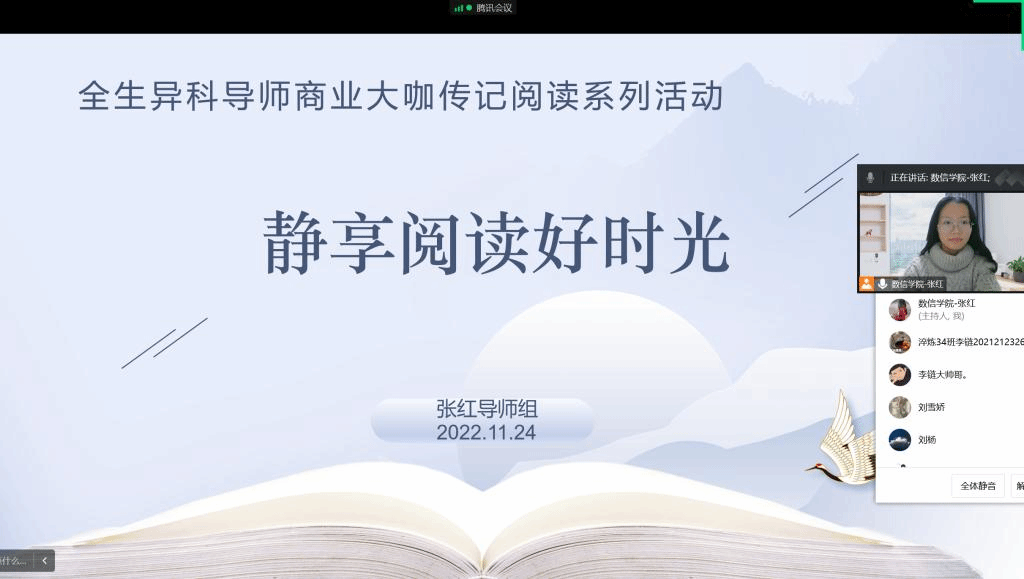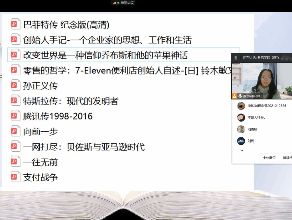疫情下,虽然不能自由活动,但是思想还是可以自由碰撞,通过阅读书籍,可以静心思考并为内心增值。12月8日中午,张红导师与她所指导的淬炼商学院·国际商学院异科同学们,在腾讯会议开展了以“静享阅读好时光”为主题的商业大咖传记阅读活动。