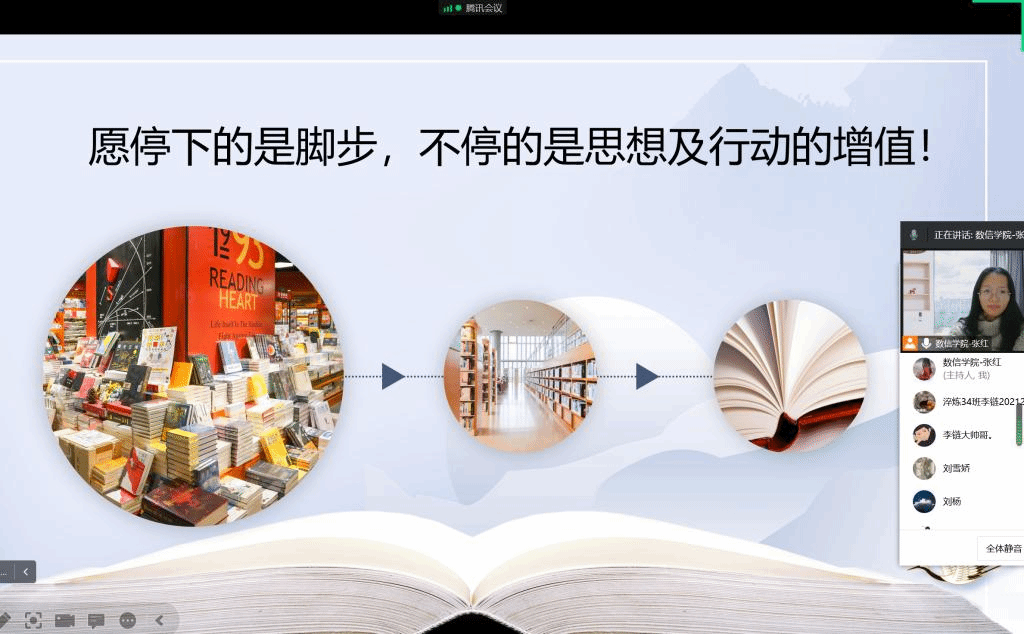紧接着,刘雪娇同学就自己阅读的《向前一步》的过程及心得,在线视频与我们做了分享。雪娇同学说自己阅读了向前一步之后,也更加明白作为女性,求学之路上,也是积累强大心灵的时段,必须认识到自己的不足,修正偏差,为后续自己在职场中,更好地展示自己的特长及能力,争做一名优秀的职场女性。王阅同学,也分享到说自己阅读这本展现女性魅力的书籍,也看到了女性在职场中也是可以有自己强大的光芒。