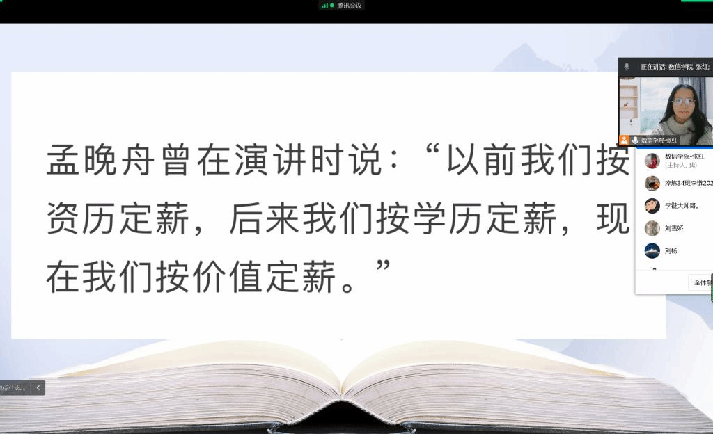 张老师依托孟晚舟女士的一次演讲词拉开阅读分享会的序幕,孟晚舟女士曾在演讲时说:“以前我们按资历定薪、后来我们按学历定薪,现在我们按价值定薪。”这其实强调的是,职场中如何在团队中创造自己最大的价值,也提醒同学们不要只是看学历一个方面。