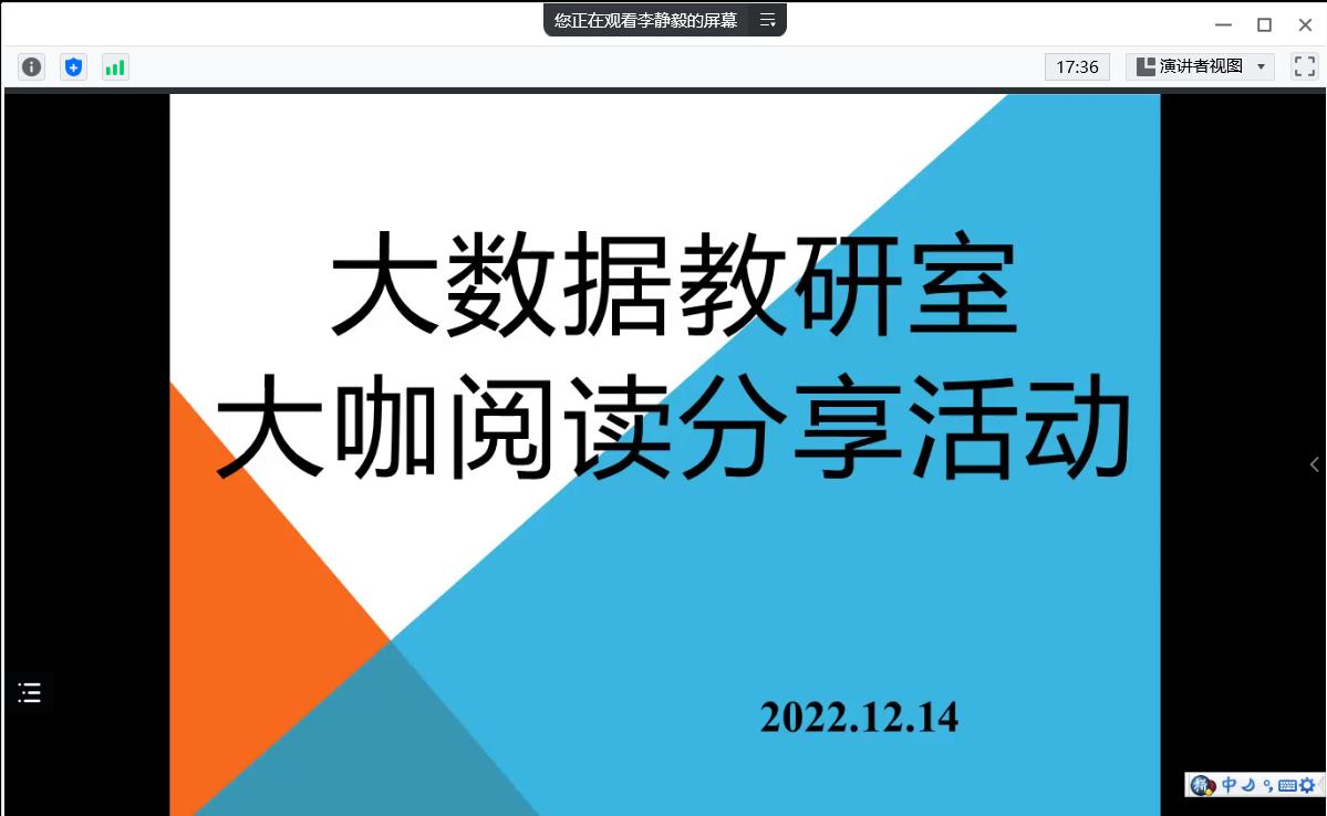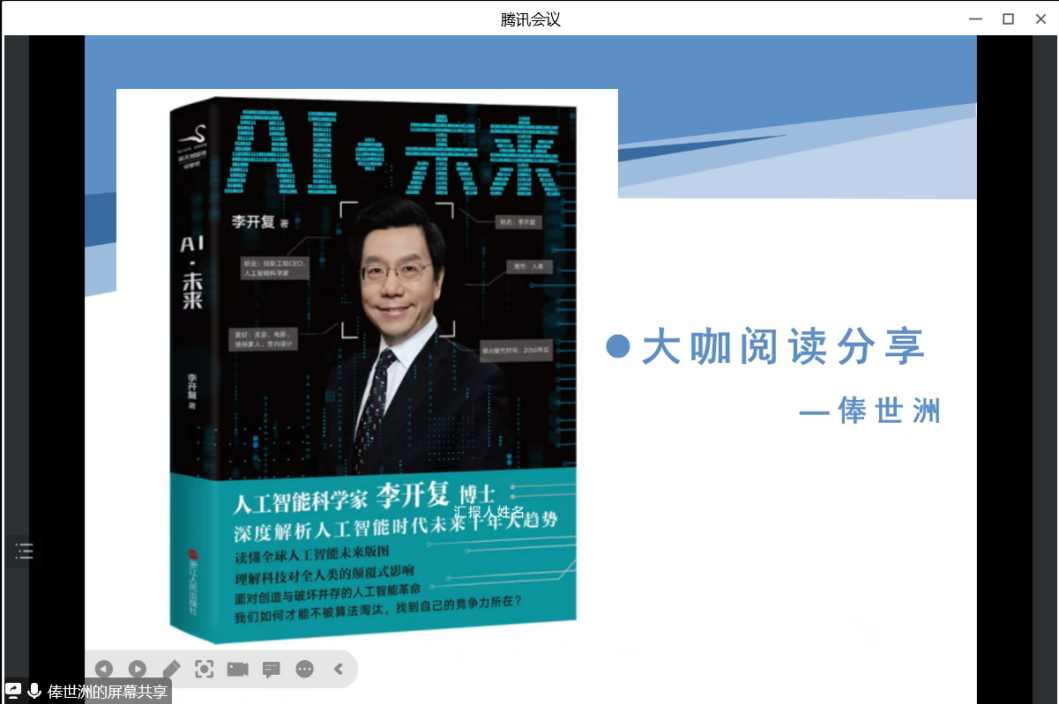 莎士比亚曾说“书籍是人类知识的总结。书籍是全世界的营养品。”书是我们人类智慧的结晶,是人类进步的阶梯,是打开知识和理想的金钥匙。为积极响应我校“信息产业大咖传记阅读计划”,12月14日下午,大数据教研室在线上开展了“大咖阅读分享活动”。本次大咖阅读分享的书籍为李开复的《AI·未来》,活动由大数据教研室主任李静毅老师主持,俸世洲、肖遥两位老师进行分享,大数据教研室全体教师参加。