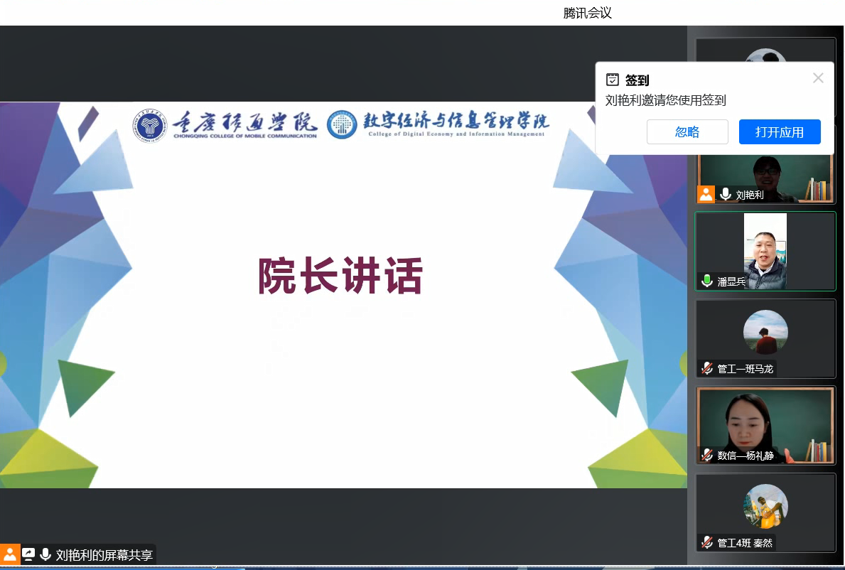 为了进一步了解同学们的校园生活,切实解决学生在学习、生活中遇到的各类问题,营造开放、宽容、和谐的校园氛围,数字经济与信息管理学院于12月14日晚19点在腾讯会议召开了以“促学明思,数言倾心”为主题的大咖阅读交流暨院长座谈会。参加此次活动的有数字经济与信息管理学院潘显兵院长、刘贵容副院长、工程管理教研室周梦娇老师、杨礼静老师、辅导员王瑞老师和2021级管理科学与工程1-4班学生代表。