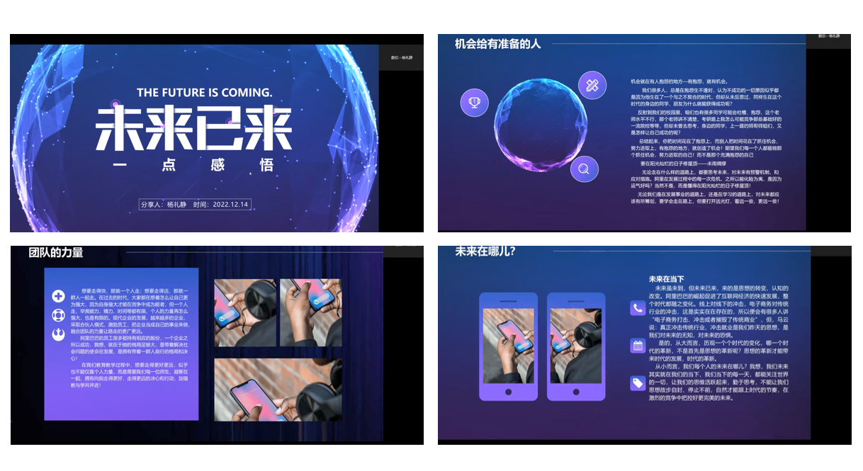两位老师的分享完毕,各位同学也带来了自己的心得体会。从戴敬韬同学的未来发展布局,到宋欣钰同学的给年轻人的三个劝告,再到杨佳伟同学未来就在眼前等,同学们纷纷发表了自己的看法和心得体会,进一步营造了和谐的阅读氛围,深化了师生之间的友谊。