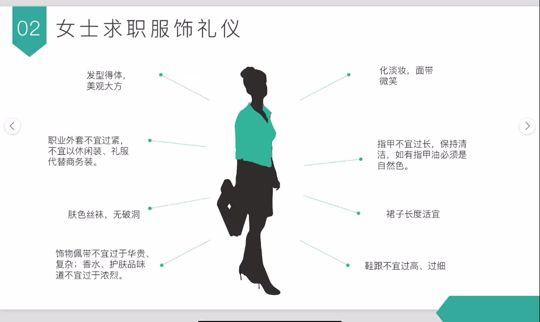 活动开始,吴丽玉老师以面试前的准备为话题,来为大家讲解关于求职基本礼仪四个板块——礼仪和求职礼仪、求职服饰、求职仪态礼仪、求职沟通礼仪。其中吴丽玉老师重点讲解了男女的服饰礼仪区别以及一些细节上的穿搭技巧。