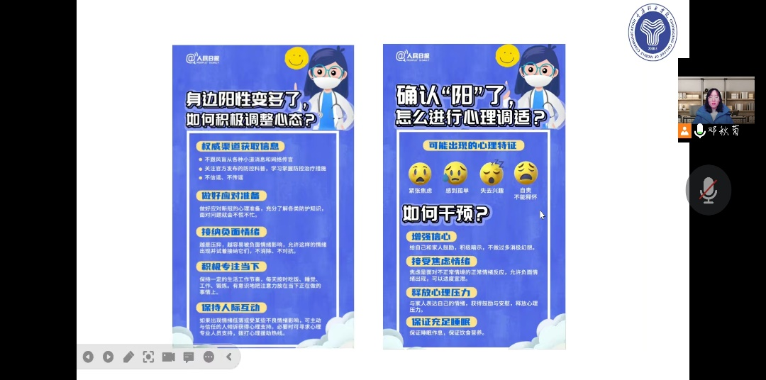 邓秋菊老师给大家讲解了相关症状以及用药、就医、居家检测、康复后的注意事项等。如让同学们对于感染新冠病毒有了科学理性的认知,以及如何正确处理“阳”。“阳”了以后该怎么调整心态呢?对于感染了新冠病毒的同学和没有感染了新冠病毒的同学,邓秋菊老师提出了增强信心;接受焦虑情绪;释放心理压力;积极专注当下;保持人际互动;多和家人朋友沟通等等措施及分法。舒缓了大家紧张的情绪。