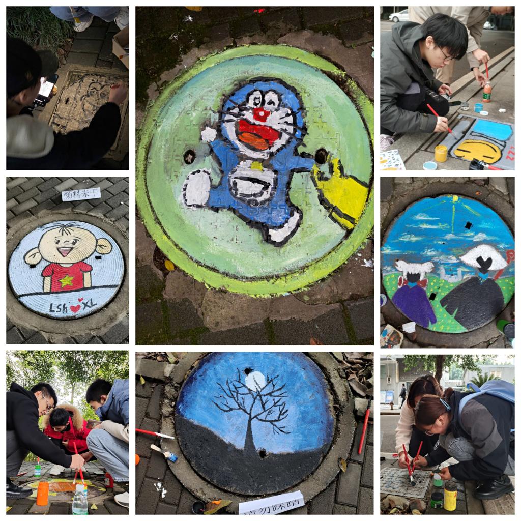 三月新绿抽芽,八月桂花飘香,十一月落叶纷飞,不同时期有着别具一格的美景,不经意低下头看到地上灰溜溜的井盖时,是否会觉得有一丝丝不和谐?由01112020团支部牵头,漫画社以及学校后勤处联合举办了井盖涂鸦的活动,充分运用想象与智慧,用双手在井盖上涂鸦,在绘画完成后放置“颜料未干,请勿踩踏”的警示标语。为校园带来了新的生机与活力,让普通的井盖变成艺术,为校园增添色彩。灰灰的井盖也能穿上新衣,形成了一种独特的井盖涂鸦文化。同时井盖涂鸦还可以提醒同学们注意脚下,降低井盖事故发生的概率,大家共同为美化校园和同学们的安全努力着。