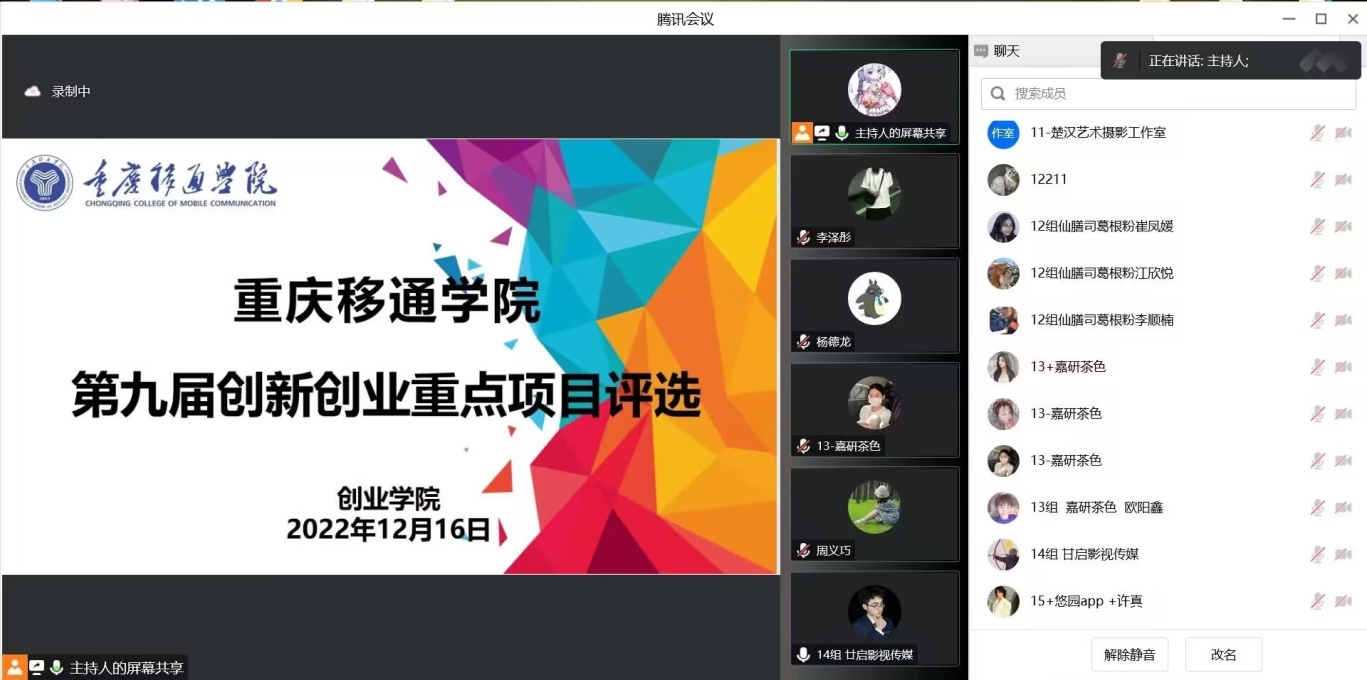 2022年12月16日14:00我校在线上进行第九届创新创业重点项目评选活动。就业创业指导与服务中心副主任、创业学院副院长佘桂隆、就业创业指导与服务中心主任助理杨德龙、就业创业指导与服务中心綦江校区毛敏、就业创业导师库导师陈巧蓉、学院就业创业办公室主任李倩、周义巧、陈锐共7位老师担任此次评选活动的评委。