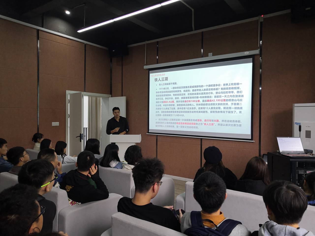 11月11日,校湘渝铁人三项队教练黄静老师走进爱莲书院,开展“我眼中的铁人三项”主题分享会。黄静老师为大家讲述了铁人三项的起源以及他在广西南宁武鸣县冬训时的经历,通过分享经历告诉大家“坚持的意义”以及“成长的力量”。在互动环节中,黄静老师为同学们进行了答疑解惑,并向同学们讲解了“铁人精神”的内涵——“铁人就是一种精神、铁人是宣言、宣告着精彩、激情和承诺,这也是对心理和体能的极大考验。这是一种说不清的精神!一种令人敬佩的精神!”