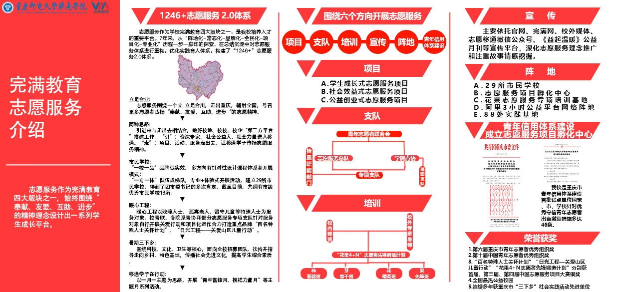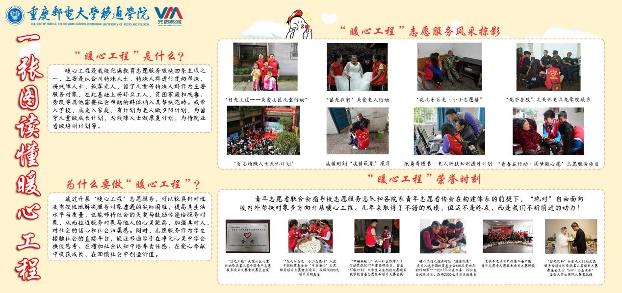 志愿精神凝聚的互动区、志愿服务项目成果展示区、特色志愿活动简介区等不同展示区域都是移通志愿服务活动的结晶。一张图,读懂整个志愿服务活动;一段字,了解整个活动内容,用最简单直白的文字与图案,解读志愿服务理念,展现我校志愿服务风采。
