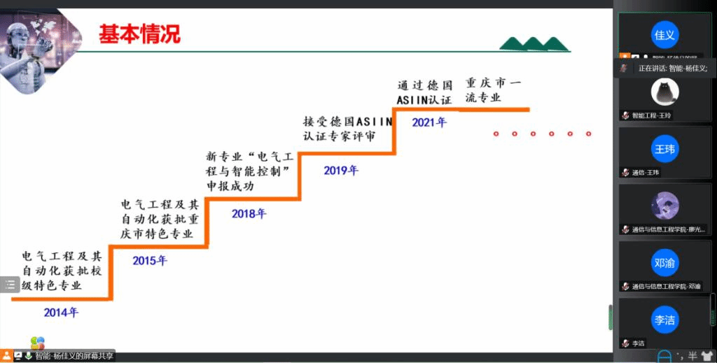 杨佳义老师向各位参会人员汇报了智能工程学院专业的发展概况,智能工程学院下辖5个教研室,共9个专业,其中电气工程及其自动化专业自2015年始先后获得市级特色专业、ASIIN专业认证和一流专业。杨佳义老师表示,智能工程学院始终秉承“厚基础、高素质、强能力、重应用”的原则,奉行“通识教育+专业教育+探索创新”多学科交叉融合的理念,以学生全面发展为中心,坚持四位一体人才培养模式,今后将继续探索通识与专业融合的发展道路,积极开展教育教学研究,不断深化学校四位一体教育教学内涵,提高教学水平和人才培养质量。
