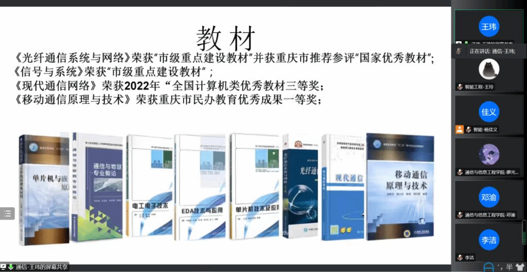 会议伊始,王玮老师分别就师资、课程、教材、校企合作、学科竞赛、学生考研与就业等方面内容对通信与信息工程学院发展现状作了简要介绍。王玮老师指出通信与信息工程学院现有43%的老师具备副高及以上职称,学院课程建设中有4门课程纳入重庆市高校一流本科课程,2门课程入选重庆市课程思政示范课程,该学院老师主编的《光纤通信系统与网络》等多本教材荣获国家级优秀教材称号,学生在各类学科竞赛中屡创佳绩,共获国家级、省部级奖项200余项,考研学子激流勇进,成功上岸东北大学、贵州大学等国内知名高校,学生毕业后大多就业于中国移动、腾讯科技等世界五百强企业,办学与育人成果十分丰硕。