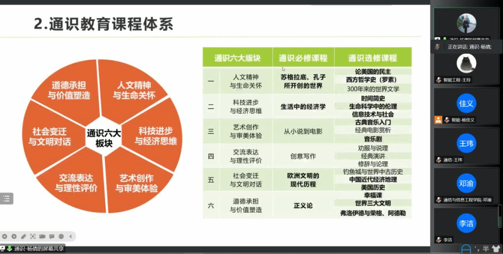 通识教学部的杨倩老师分别从人文精神与生命关怀、科技进步与经济思维、艺术创作与审美体验、交流表达与理性评价、社会变迁与文明对话、道德承担与价值塑造六大板块系统地介绍了通识教育课程的完整体系,杨老师指出,通识教育是以人为本的全面素质教育,是培养学生健全人格和可持续发展能力的重要载体,是人才培养目标的关键环节。