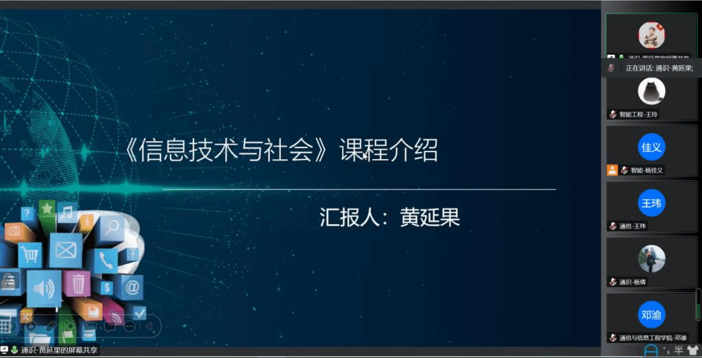 通识教学部黄延果老师重点介绍了科技发展与经济思维板块下的跨学科课程——信息技术与社会,黄老师指出,该课程旨在对互联网、大数据、人工智能等新一代信息技术深入了解,并通过热点分享、小组讨论、课堂陈述、微视频主题拍摄等方式将其融入课堂教学,带领学生思考信息技术对社会带来诸多影响。黄老师强调,课程着重于训练学生的批判性思维和跨学科认知能力,培养学生的社会责任感。