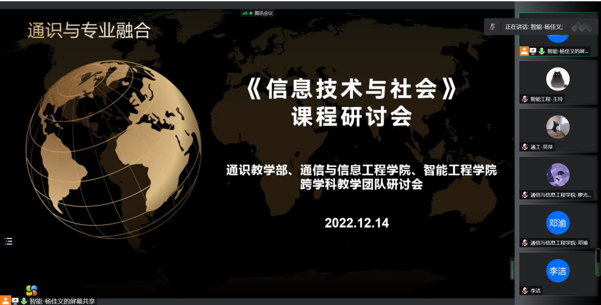 12月14日下午,通识教学部、通信与信息工程学院、智能工程学院跨学科教学团队研讨会通过腾讯会议顺利举行,会议以通识教育与专业教育融合为主题,采取“主题报告+自由发言”的方式,分别就学生的通识素养、双师授课、共享案例库、教研合作等方面内容进行了重要交流和讨论。本次会议由智能工程学院杨佳义老师主持。