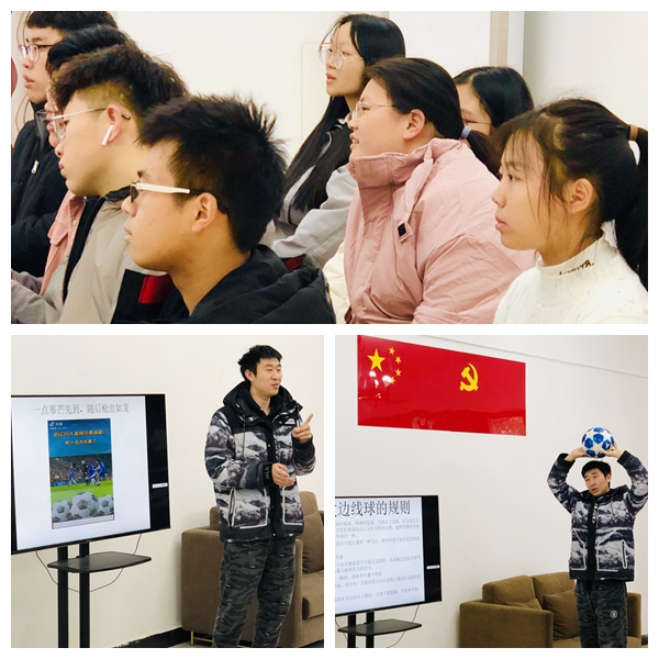 陈政忠同学首先为大家讲解了一些足球的发展历史和基础知识,并结合足球典型赛事,生动形象地介绍了足球发球,点球的动作要领和比赛的相关规则,讲解深入浅出,深深地吸引住了同学们的注意力。同时,问答环节更是带动了现场的活动气氛。