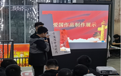 爱国经典重温、爱国作品制作、爱国作品展示。一幕幕历史记忆重现眼前,一幅幅经典画面重温心间……为了传承爱国情怀,引领学生树立爱国志向,苏盼盼老师带领同学们在北山书院红岩馆开展了年级会。同学们多次排练热情洋溢。书法、印章雕刻、剪纸、树叶绘画、手绘海报、文化衫设计六种活动方式,燃起了同学们的渴望与期待。每一组的同学以自己所选择的方式传递着他们对祖国浓厚的感情与自己的报国志向。