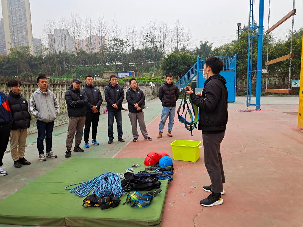 拓展训练部外墙上有一句话“没有完美的个人,只有完美的团队”。本次为教练们准备的安全培训课不单是强调在进行高空项目时应该注意保护措施,更强调协调合作与精准配合。