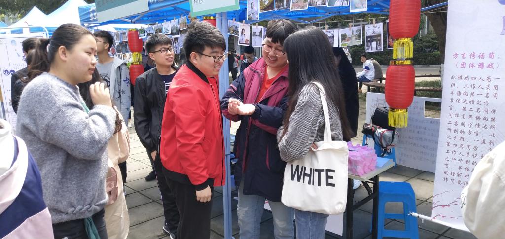 你是否想去品尝长沙臭豆腐,河南烩面,武汉热干面等无数让人垂涎欲滴的特色美食,是否想感受湖南张家界的鬼斧神工,是否想亲眼目睹“冲决巴山群峰,接纳潇湘云水”的湖北黄鹤楼……开幕式现场三个地区特色美食和名胜古迹的图片和介绍,更有朱一龙刘昊然等当地名星的人形立牌,都引起同学们来围观驻足拍照,“方言传话筒”和“方言猜猜猜”两个特色方言小游戏,更是吸引同学们前来参与,外地同学学习方言的生涩语调,同学们互相传递着方言,好不温馨热闹。