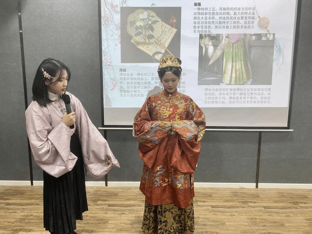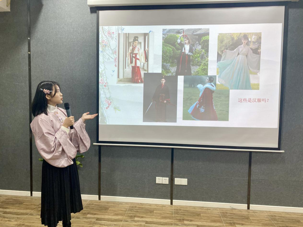 唐玉立同学从汉服基本形制和纹样入手进行讲解,小到细节处的制作技艺,大到不同时代背景下汉服的发展变化,她都如数家珍娓娓道来。“汉服文化历经唐、宋、明等强盛时期,贯穿整个中华民族古代史,其制作工艺也随之被赋予更多寓意,一件精雕细琢的汉服包含着各式各样的花纹、刺绣,而绣花是其中最为精细的工艺之一。”同学们从她的分享中不仅感受到了汉服的魅力,也领略了中华民族传统文化的博大精深。