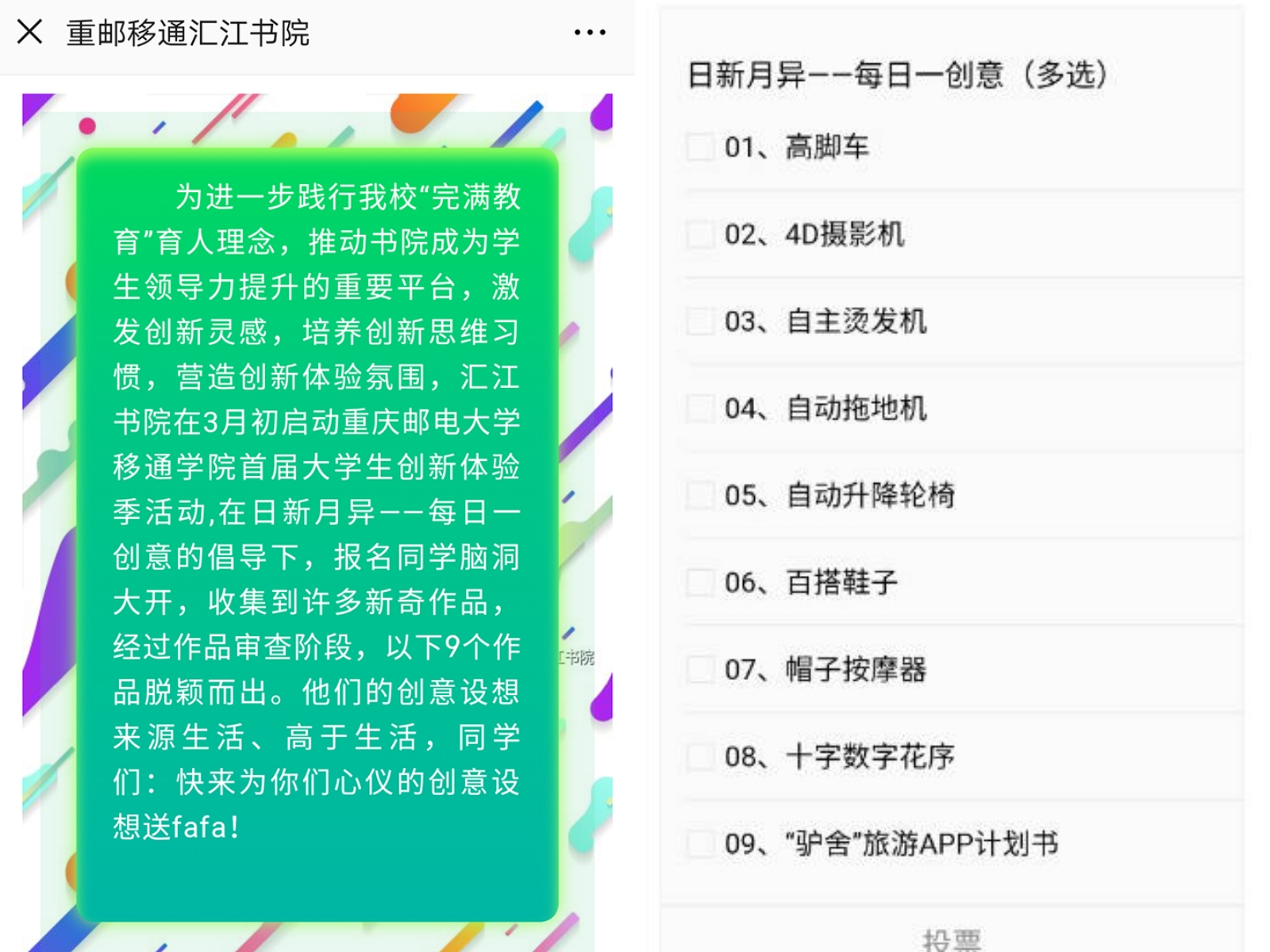 在“每日一创意”的倡导下,报名同学立足生活需求,脑洞大开。如设计带有高脚车轮的医院救护车在必要的时候可以不受阻碍的通行;设计利用高清摄影机4D效果拍摄国内各地景点,帮助人们在一个地方就能感受到祖国各地风情;设计一款时尚、可按摩头部的帽子缓解疲劳;用数字花序表达人生“数”途同归。