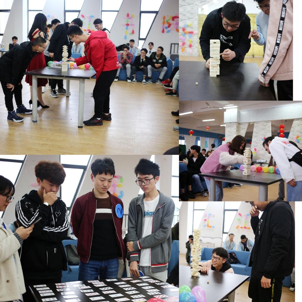 在“脑力对抗体验站”的互动中,参与学生斟酌探索,寻求未知。“空间王者”——叠叠木项目挑战,设计理念来源于古代汉朝的黄肠题凑木模,它简单易操作,考验同学们手眼协调能力、意志力、平衡力和空间感,同时搭放的过程也能提高耐性和自制力,参与挑战的同学一边思考抽取哪一木块木塔不会倒塌,一边思索如何在摆放木块时增加对手的难度。随着木块的抽取与搭放,挑战由易到难,这不仅考验同学们的动手能力,更是一种思维的锻炼。“记忆王者”——抽纸牌项目挑战,来源于国内大型脑力竞技真人秀节目《最强大脑》中的比赛项目,意在培养、考验学生的瞬间记忆和空间识别。每轮每组有4人参与对抗,桌上摆放64张扑克牌,挑战者用1分钟时间记忆牌阵,并需依次翻出排阵中的相同一组纸牌,记忆越准确且用时最短的人获得最后胜利。计时开始时,同学们目不转睛地盯着桌上各种花色的纸牌,他们在一分钟之内不仅要记住每张纸牌的颜色,也需要记住相同两张纸牌所在的位置。记忆过程中同学们采取多种方法,挑战结束后挑战者和同学们分享并探讨各种记忆方法的优劣。