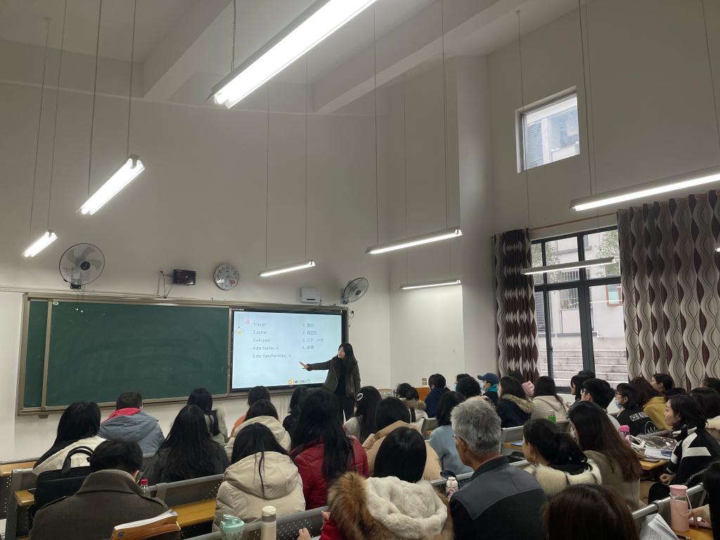 本学期,外国语学院新进多位青年教师,为提高青年教师的课堂教学技能,同时展现新教师教学水平,促进新教师快速成长,外国语学院于12月9日下午16:10在天渠104教室举行了新进教师公开课。本次公开课主讲教师为德语专业教研室武桐老师,主讲课程为《基础德语(1)》。外国语学院全体教师参加。