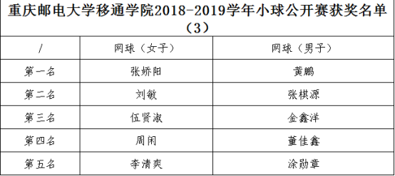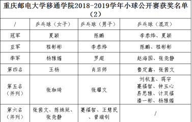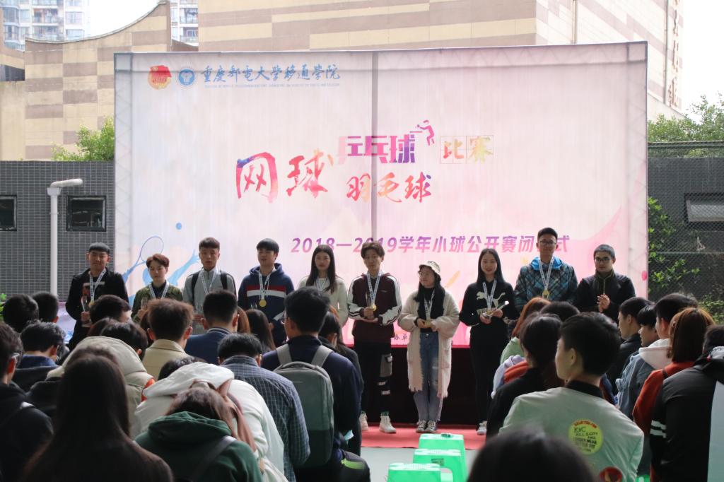 2019年3月26日,重庆邮电大学移通学院2018-2019学年小球公开赛闭幕式暨颁奖典礼于C区风雨篮球场圆满落幕。本次小球公开赛历时二十天,由学生体育联合会、学生社团联合会共同举办,为广大球类爱好者提供展现自我的平台。颁奖典礼邀请竞技体育中心谈胜老师、团委黄杜娟老师、乒乓球指导老师甘素老师、羽毛球指导老师胡垚老师、网球指导老师任德利老师莅临现场。