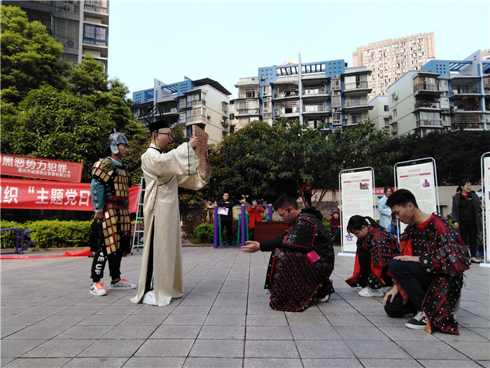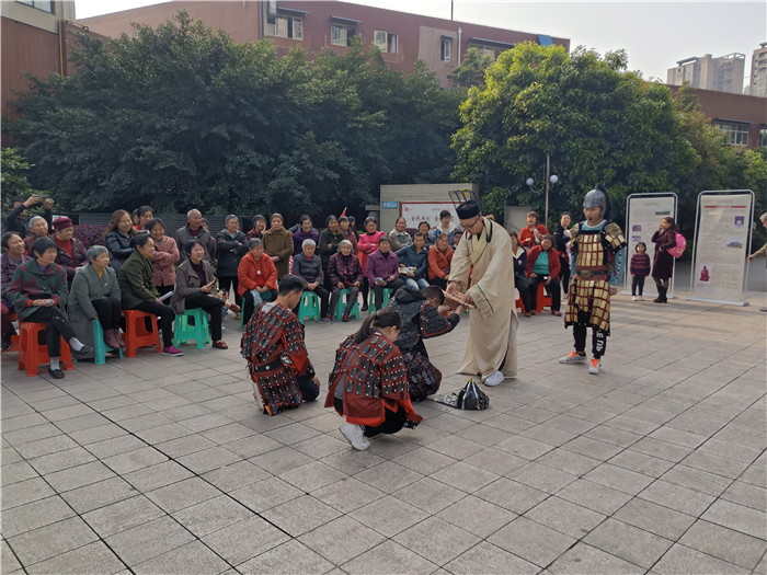16点,钓鱼城研究会的同学们如约来到了龙苑社区。一到现场,就各施其职,有条不紊的忙活起来。社区的居民也陆续来到这里等待观看他们的表演了,他们脸上洋溢着灿烂的笑容,这也深深感染了同学们。钓鱼城研究会综合管理部部长乐政均同学向居民们介绍了活动的流程和的目。