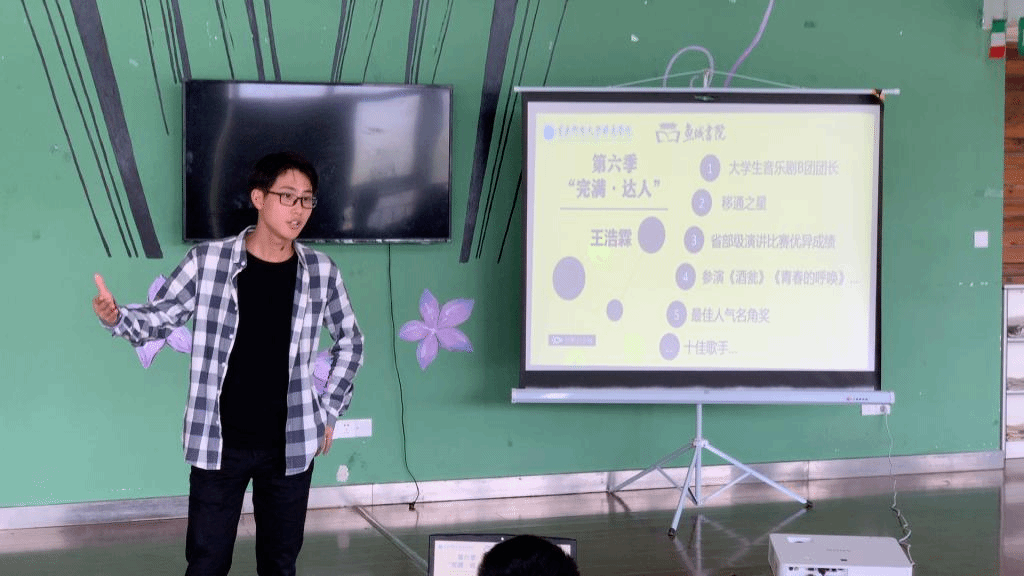 主持人罗列了王浩霖学长在校期间参加的各类活动和获得的各种荣誉,成功的挑起了同学们的好奇心,想要知道他是如何在茫茫人海中脱颖而出的吗?话音未落,伴随着同学们的掌声,王浩霖学长站到了台前,以一首歌做了分享会的引入,抓住了所有人的注意力。
