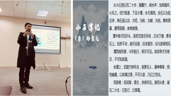 方老师指出,虽然柳宗元命运坎坷,可是正由于经历了半生浮沉和无常命运,使得他能够“处江湖之远”,更多地接触到劳苦民众,目睹晚唐统治的腐朽,从而写出了如“赋敛之毒有甚于蛇毒”这样为民请命的千古文章。柳宗元终其一生,留下600余篇诗文作品,涵盖论说、寓言、传记、山水游记、诗词骚赋等。方老师并以《小石潭记》为例着重分析了柳宗元的山水游记。《小石潭记》全文193字,通过移步换景、定点特写、变焦等手法,有形、有声、有色地刻画出了小石潭的动态美,写出了小石潭环境景物的幽美和静穆,抒发了作者贬官失意后的孤凄之情。