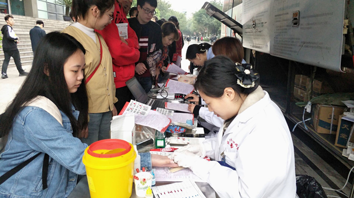 4月2日的早晨,志愿者们提前搭建好服务站点,并轮班为前来献血的同学们提供服务和帮助。服务站点为同学们提供了献血知识宣传册,让同学们在等待和休息之余,可以更加了解献血的相关知识。在志愿者们的引导下,前来献血的同学们有序地排起长队,依次进行信息登记、血液类型检验等环节。由于体检的要求十分严格,献血等候的时间比较长,但大家并无怨言,依然井然有序地排好队等待体检。通过血检后,大家有序的上车进行献血,完成献血的同学们得到了献血证或献血印章。一位来自大数据与软件学院的大一学生在接受采访时表示:第一次献血有点紧张也有点害怕,但是想到自己的行为在日后可能会挽救一个人的生命,便觉得十分开心。而另一位接受采访的大四学长则表示:献血车上的医生们非常认真负责,不断地询问自己是否有任何不舒服的地方,志愿者们贴心的在一旁送上葡萄糖水也让自己十分感动。