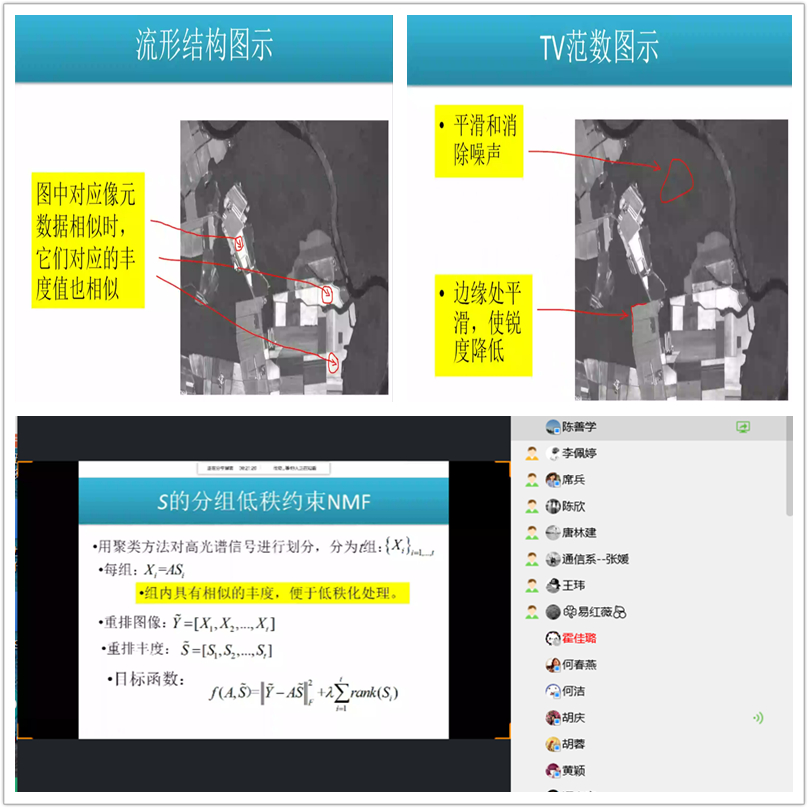本次线上讲座,陈教授始终围绕着高光谱图像的非负矩阵解混展开。陈教授首先从一般线性解混的流程开始进行介绍,并说明了非负矩阵分解后的模型与混合像元解混模型相似,适于解决光谱解混问题。随后,陈教授一一细致地介绍了在不同处理情况下的原理和目标函数的具体意义以及用图示说明其特点或不足之处。陈教授在讲座中无时无刻不展露着他严谨的科研态度,从对大量的公式、数据分析的熟悉和描述中更是体现无疑。
