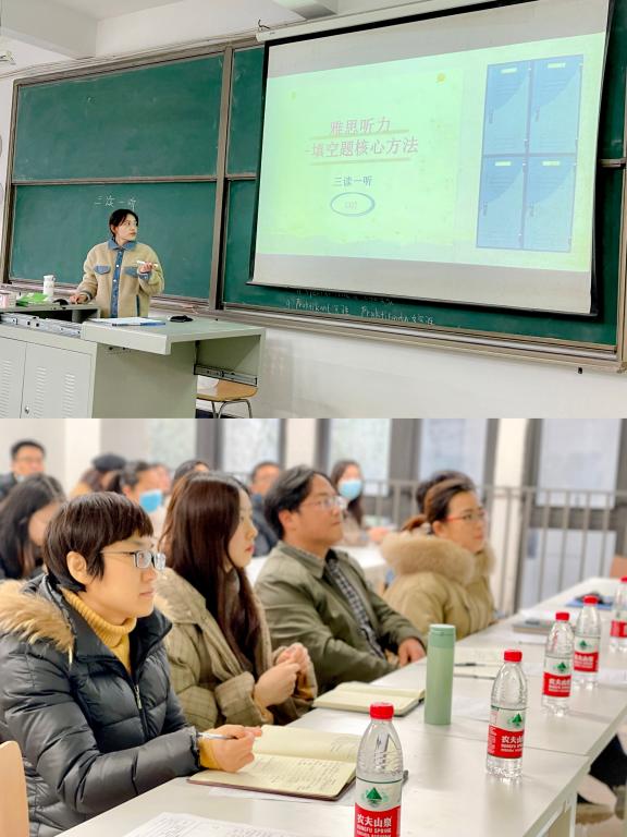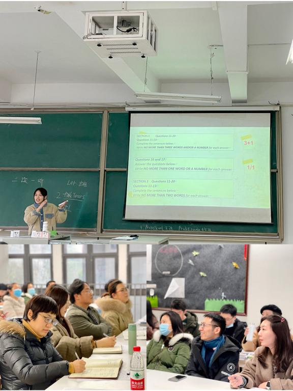公开课上,蒋老师通过有趣的“找钥匙”的游戏方式把我们引入到课堂教学中,并延伸出雅思听力考试中填空题的正确做题步骤以及方法:首先字数限制是做题的关键,同学们在审题时要着重注意阿拉伯数字以及+,或者/ 等符号将字数限制要求,并标注;其次,分析题干以及答案空;最后,勾画题目的关键词时的侧重点,先直接定位词再间接定位词。每次引导同学们找到正确的“钥匙”后,蒋老师也会利用习题演练来验证该方法的正确性。在场的老师们都沉浸在这种趣味性的教学模式中,并纷纷表示蒋老师的课堂是“乐教、乐学”的鲜活体现。
